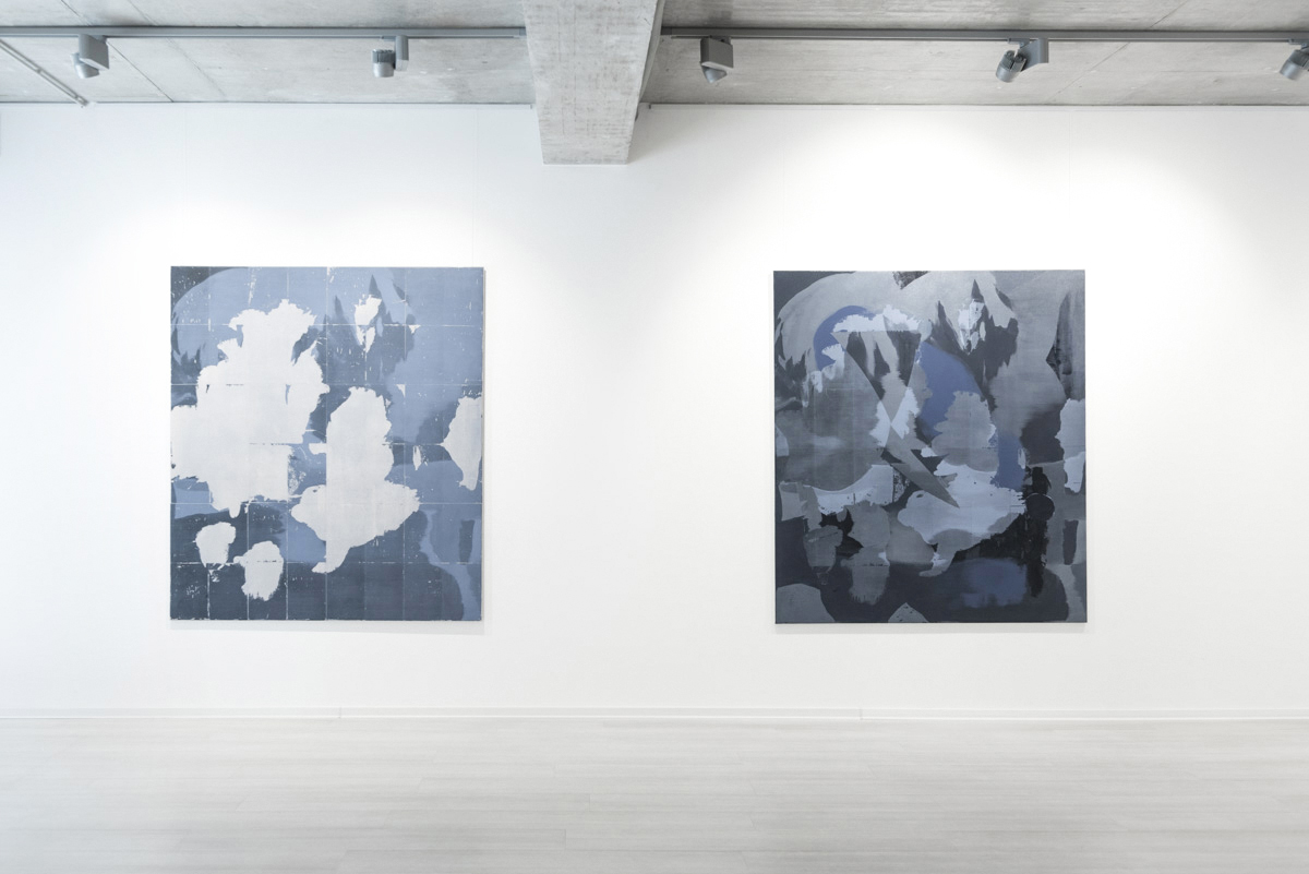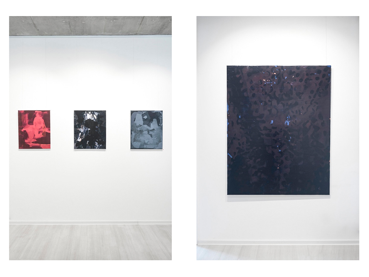 Earlier approaches of generating images through the filter of digital media (raster, noise and graininess of the image/screen) have now been replaced by the regeneration of the painting canvas. The exhibited series of works is based on a 17th century saying, which means overall renewal, rejuvenation and regaining one’s strength and vigour. Metaphorically, it also refers to snakes shedding their old skin – this is the process that Michal Czinege’s current paintings undergo. It is about the renewal of the pictorial field, its figurativeness and materiality through the layered nature of the painting. This personal “healing” of the pictorial surface can be perceived as a time-lapse imprint of constantly renewed old layers, the storage of memories, their fragments into one integral / imperfect painting, or the painterly reconstruction of a lost or damaged painting. To the painting itself, Czinege adds the transfer of acrylic surfaces and pigments, the overlapping of individual levels, layers and seams. Although it is a technical mirror projection of prints onto the pictorial surface, we still remain in the field of painting – we witness a living painting process and search.
