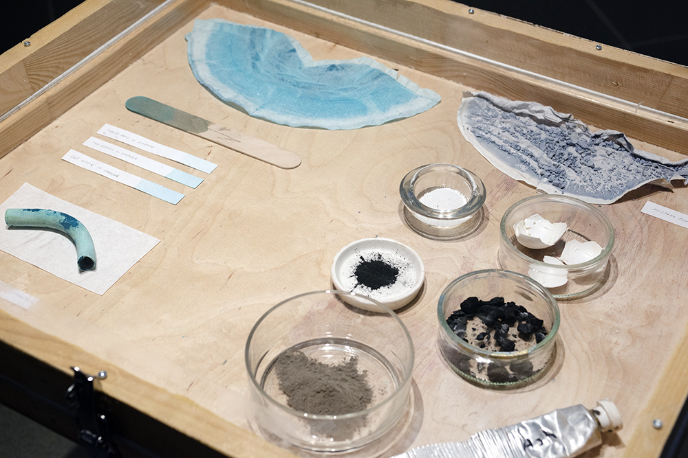 Auxiliary instruments for making copper ink, piece of copper pipe after two weeks in vinegar bath, pigment from egg shells, pieces of eggshells, pigment from charcoal, pieces of charcoal, 2020