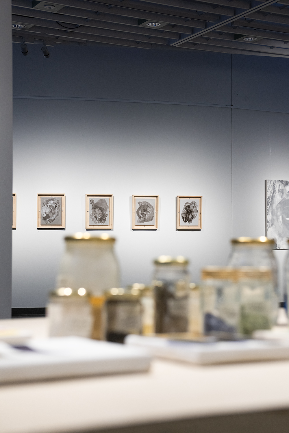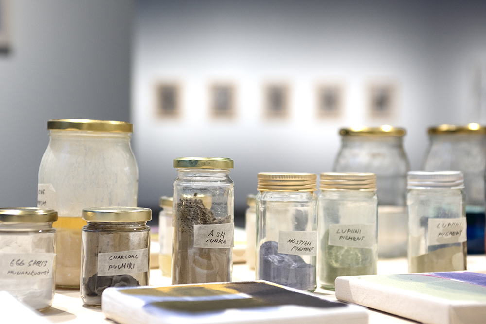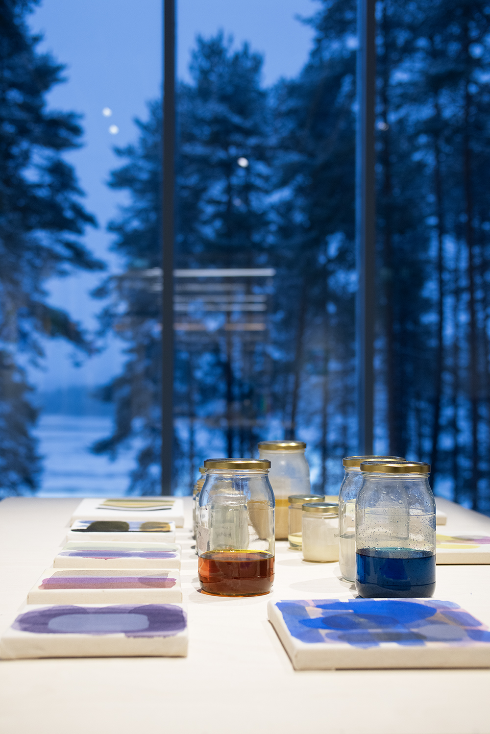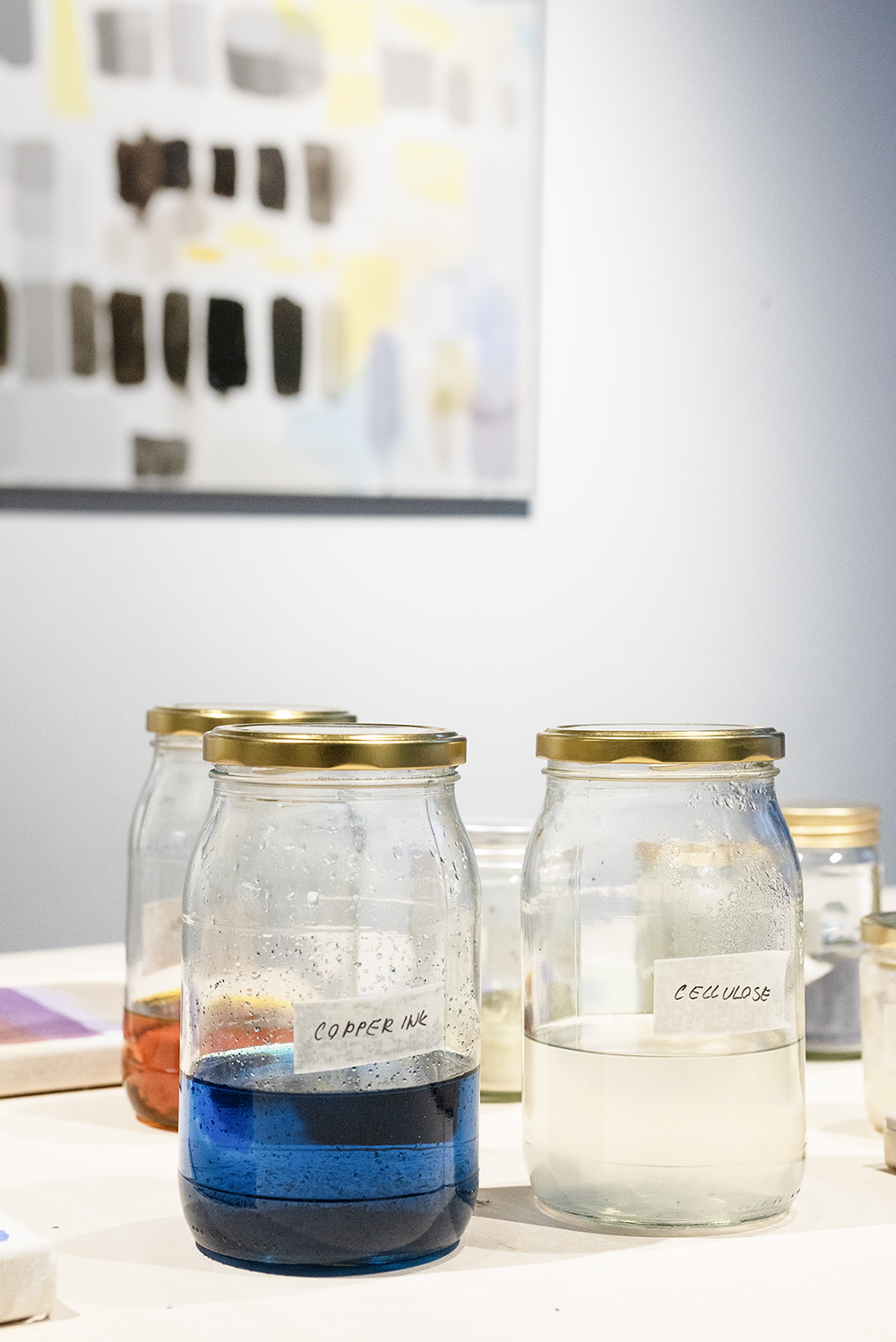 Testing canvases, small glass jars with pigments (from lupine flowers, blueberries etc.), bigger glass jars with natural inks (from curcuma with rubbing alcohol, copper with vinegar etc.), glass jar with cellulose, glass jar with nontoxic oil glaze medium own mixture, 2022–23
