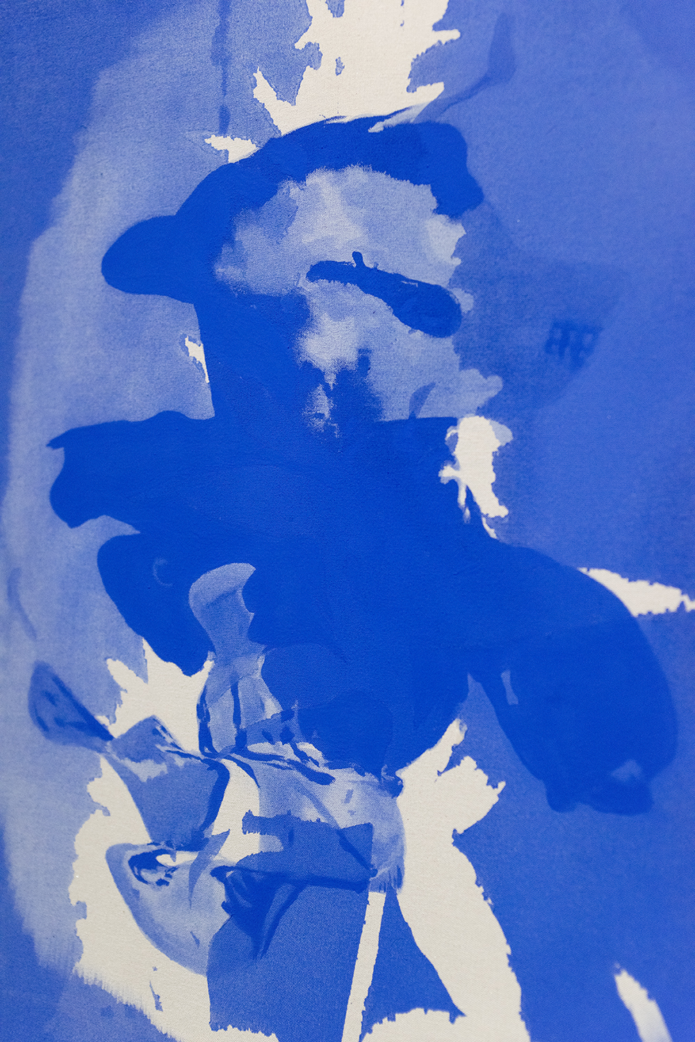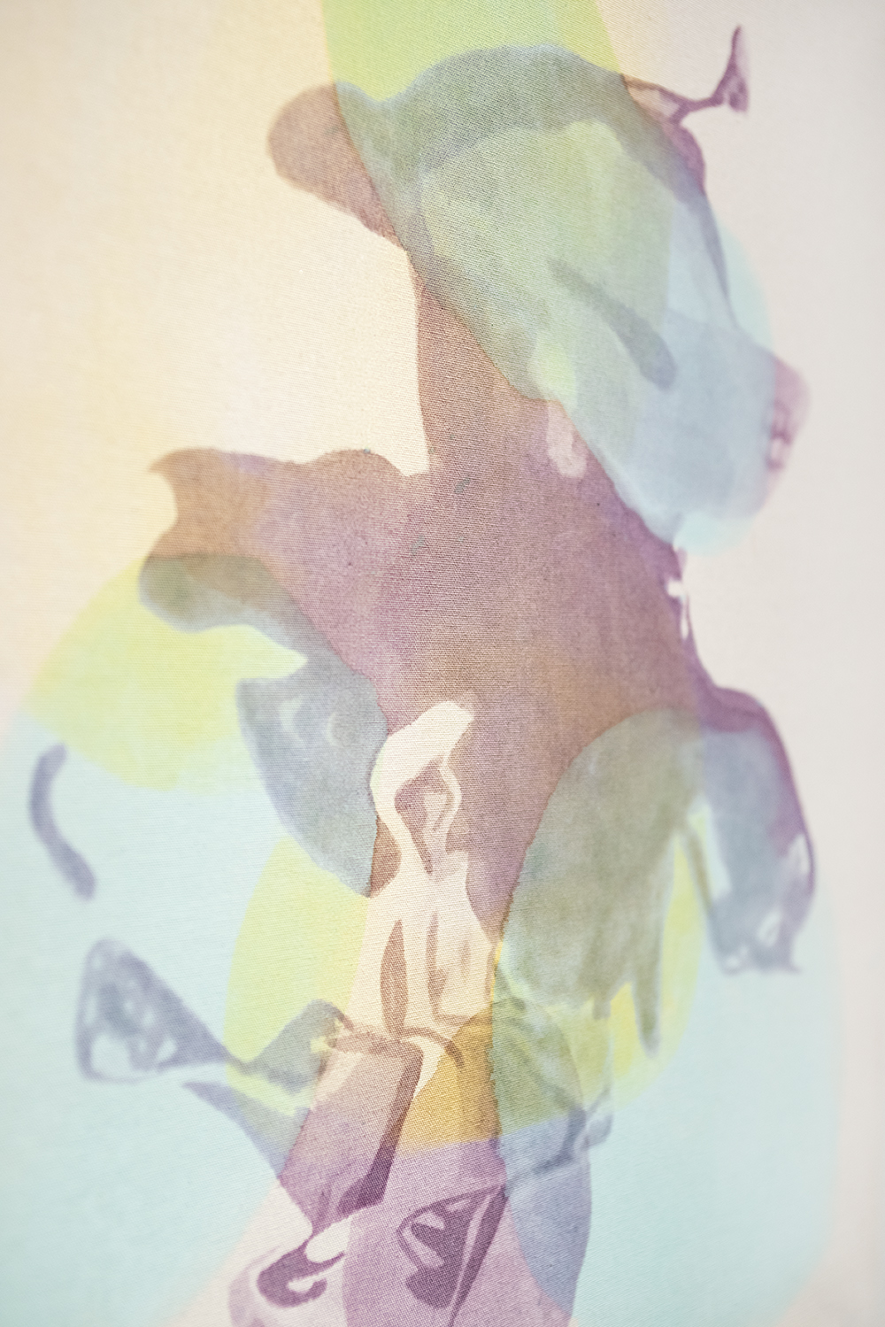 Friendly Floatees 2, 2023. Cellulose, natural ink from blueberries, copper ink with vinegar, natural ink from curcuma with rubbing alcohol on cotton, 60×50 cm (detail)