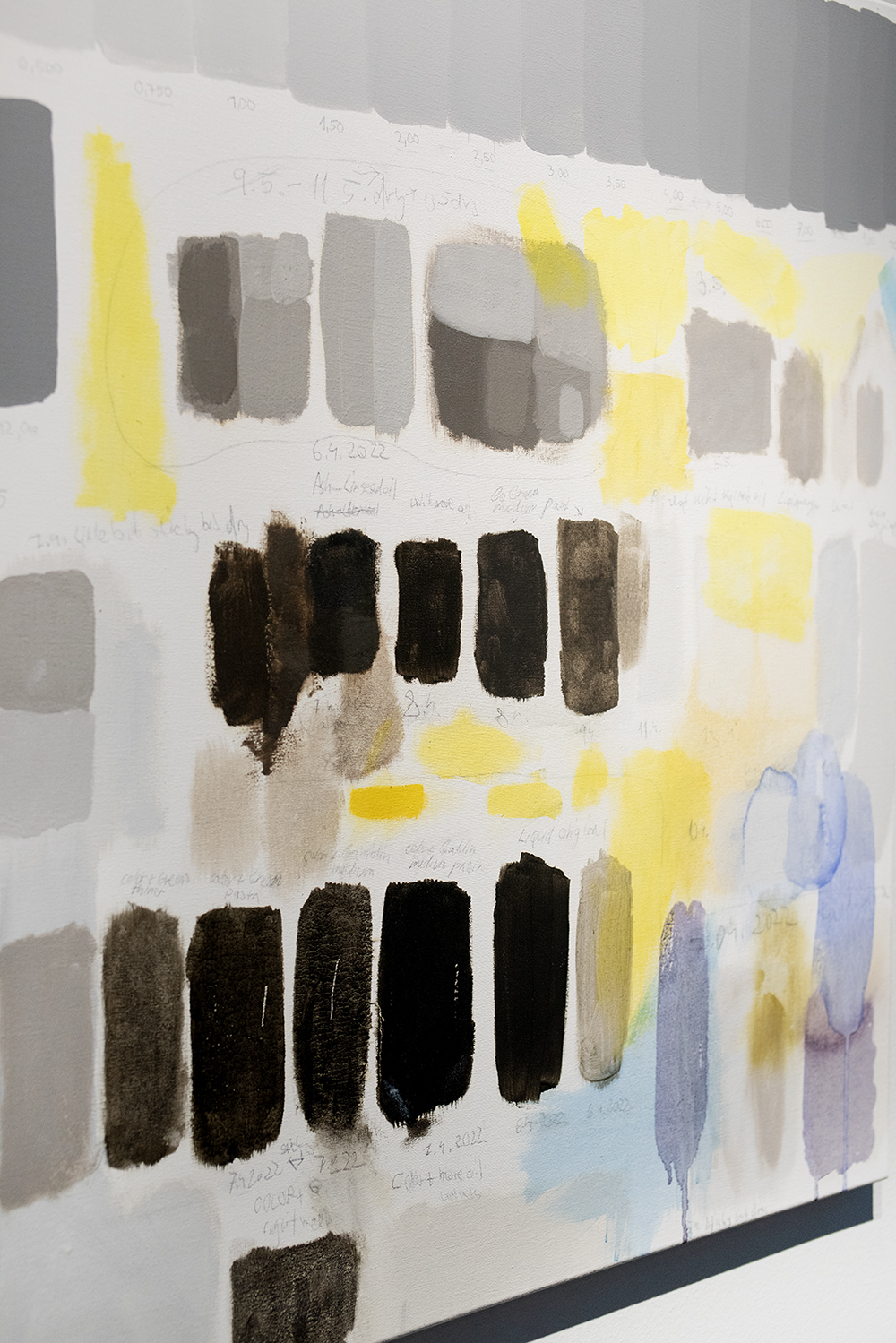 Näyttely on kosketus vuosien muutosprosessiin. Mukana on viimeisimpiä kokeita musteiden valonpitävyydestä kuin myös maalauksia ensimmäisillä itse valmistetuilla öljymaaleilla. Menetelmät ovat hitaita. Ainesosien kerääminen, maalausaineiden hidas kuivuminen ja niiden monivaiheinen valmistus epäonnistumisineen vievät aikaa. Työskentely rytmittyy materiaalien ehdoilla eri tavoin kuin ennen. Lähtökohtana on ollut, ettei muutos vaikuttaisi merkittävästi teosten ulkonäköön tai sisältöön, mutta vaikutukset ovat sitäkin kokonaisvaltaisempia ja ovat saaneet Czinegen punnitsemaan taiteellisen tuotannon arvoja laaja-alaisesti. Tutkimusmatka ei ole vielä tullut päätepisteeseensä.